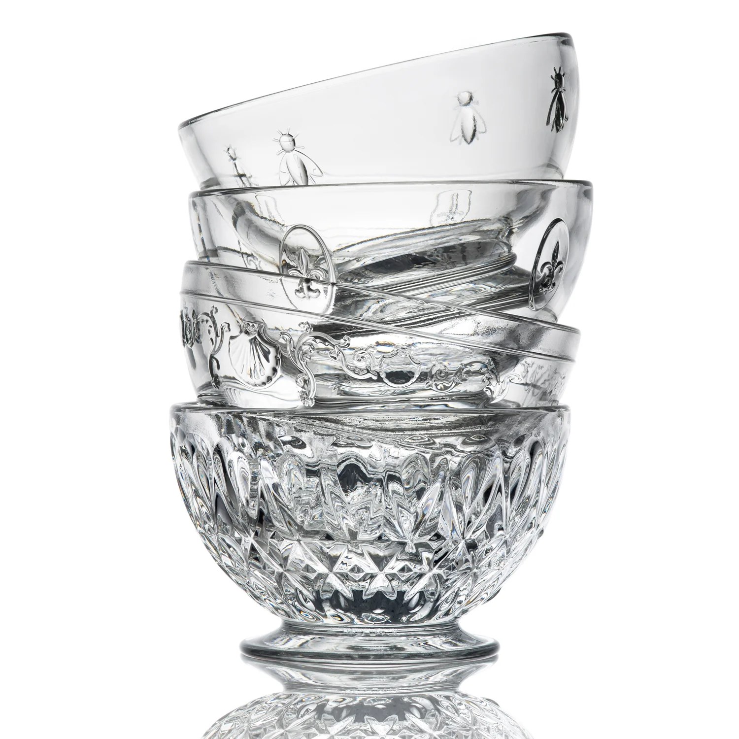 Mini bol en verre pressé sur pied. Décor baroque, volutes de fleurs et de coquilles Saint-Jacques.